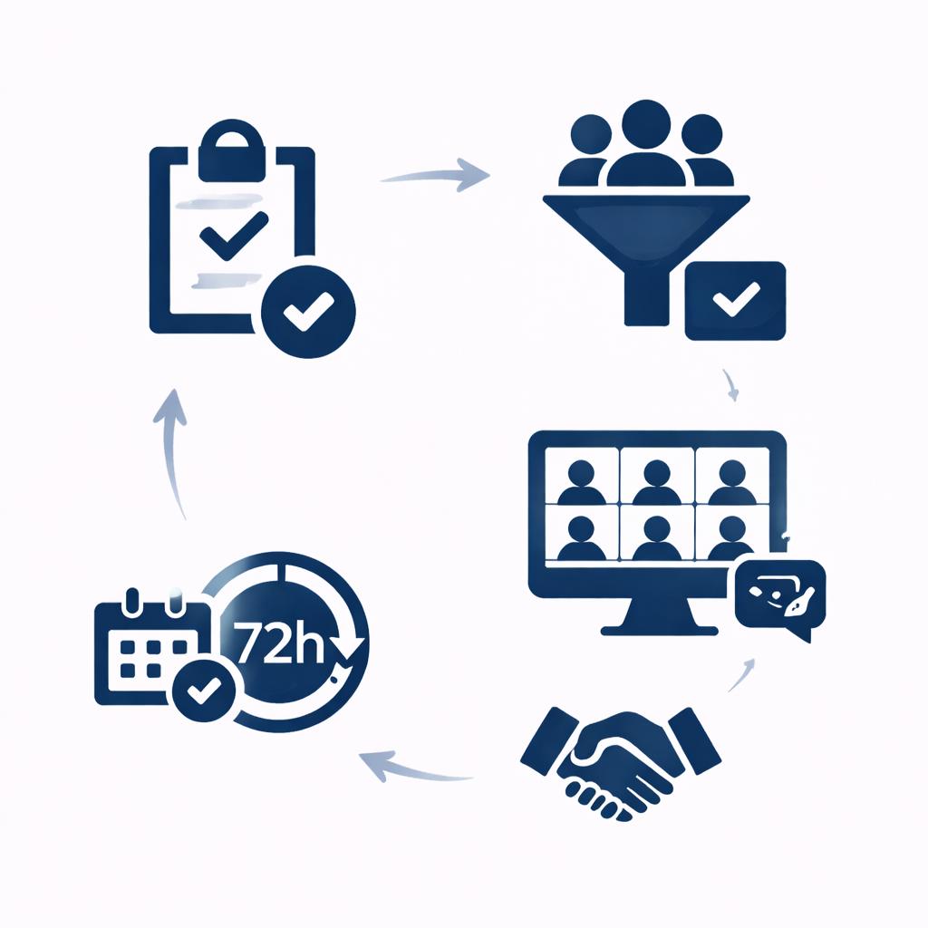 المخرجات: اجتماعات محجوزة والإجراءات التالية مؤمنة خلال 72 ساعة.