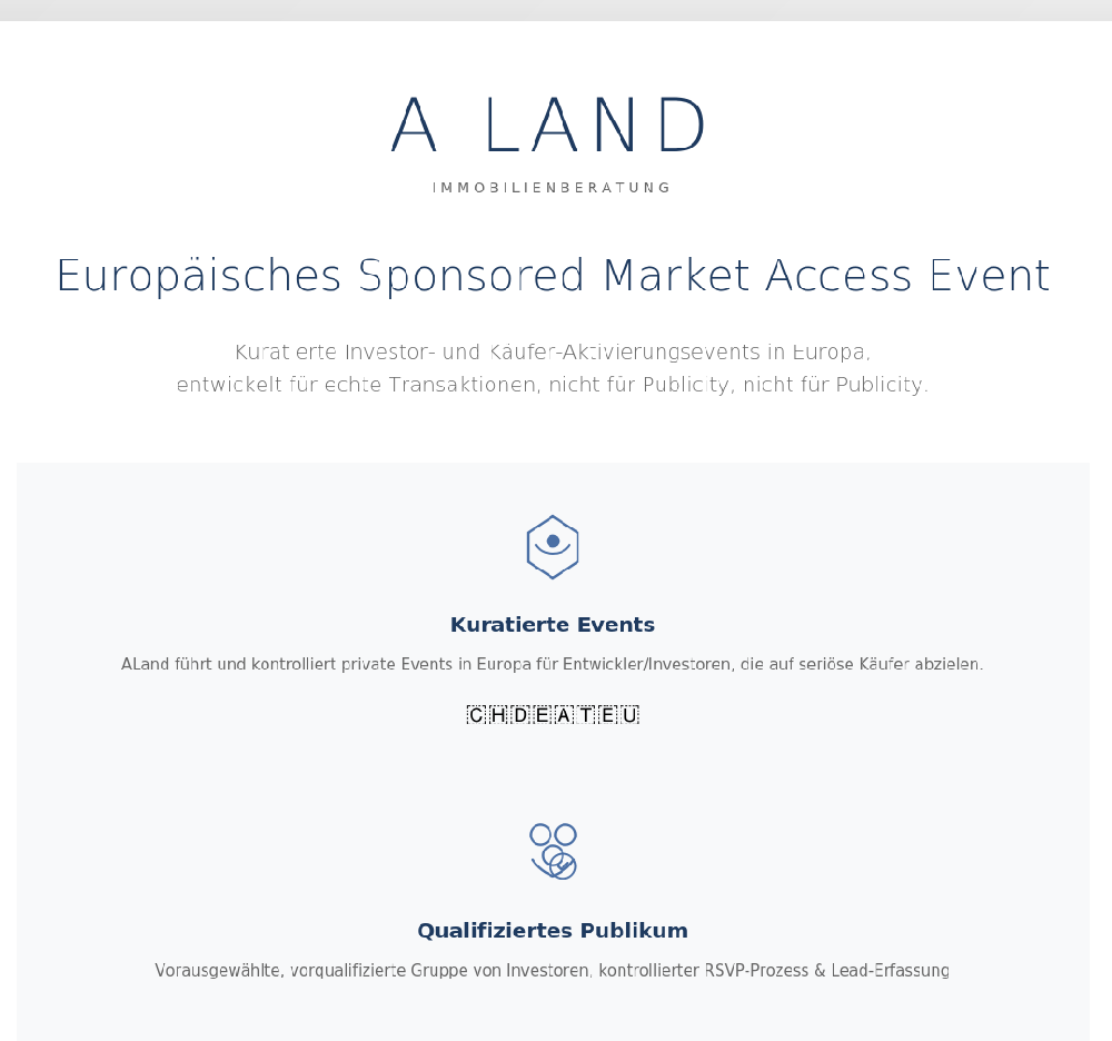 ALand konzipiert und realisiert private Investoren- und Käuferaktivierungsveranstaltungen in ausgewählten europäischen Finanzzentren und verbindet Ihr Projekt mit vorab geprüften Akquisitionsgruppen, Family Offices und qualifizierten Endkäufern.