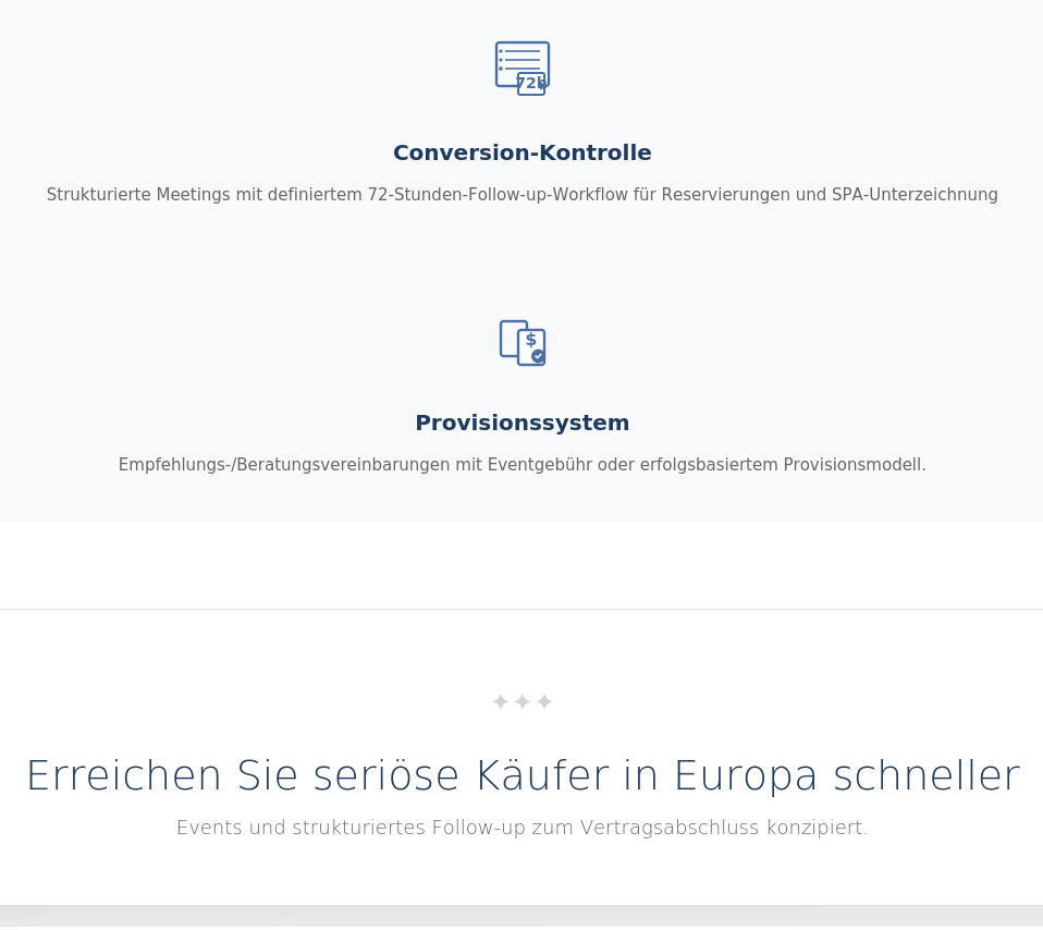 Eine private, auf Konversion ausgelegte Investorenveranstaltung in Europa, konzipiert, um qualifizierte Käufer vom Erstkontakt bis zur Reservierung und zur Unterzeichnung des Kaufvertrags (SPA) zu führen.