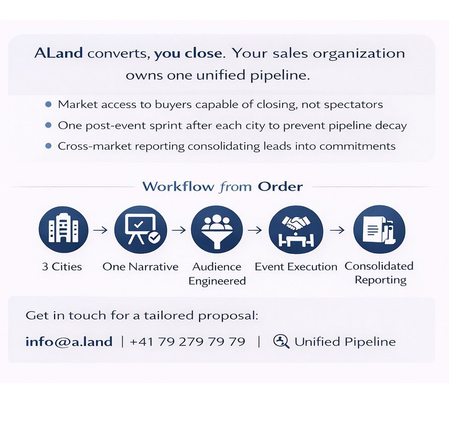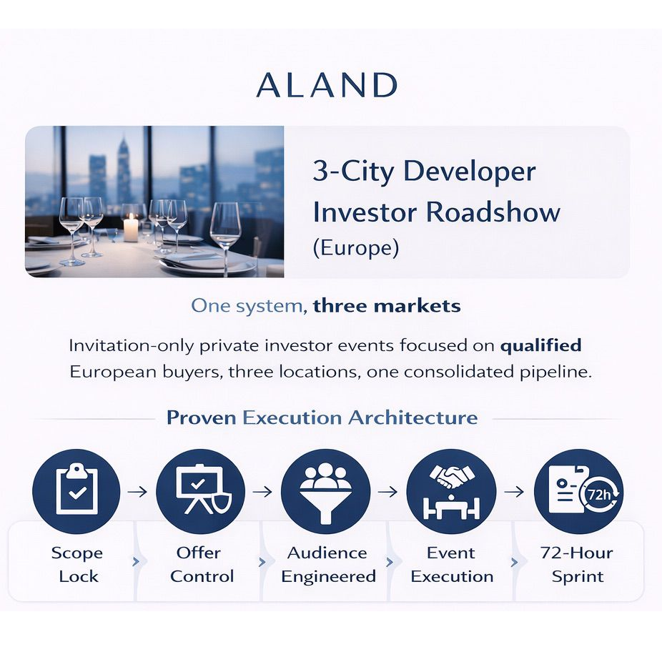 A multi-city investor activation program executed across three European financial centers. ALand controls the mechanics that turn roadshows into contract pipelines: