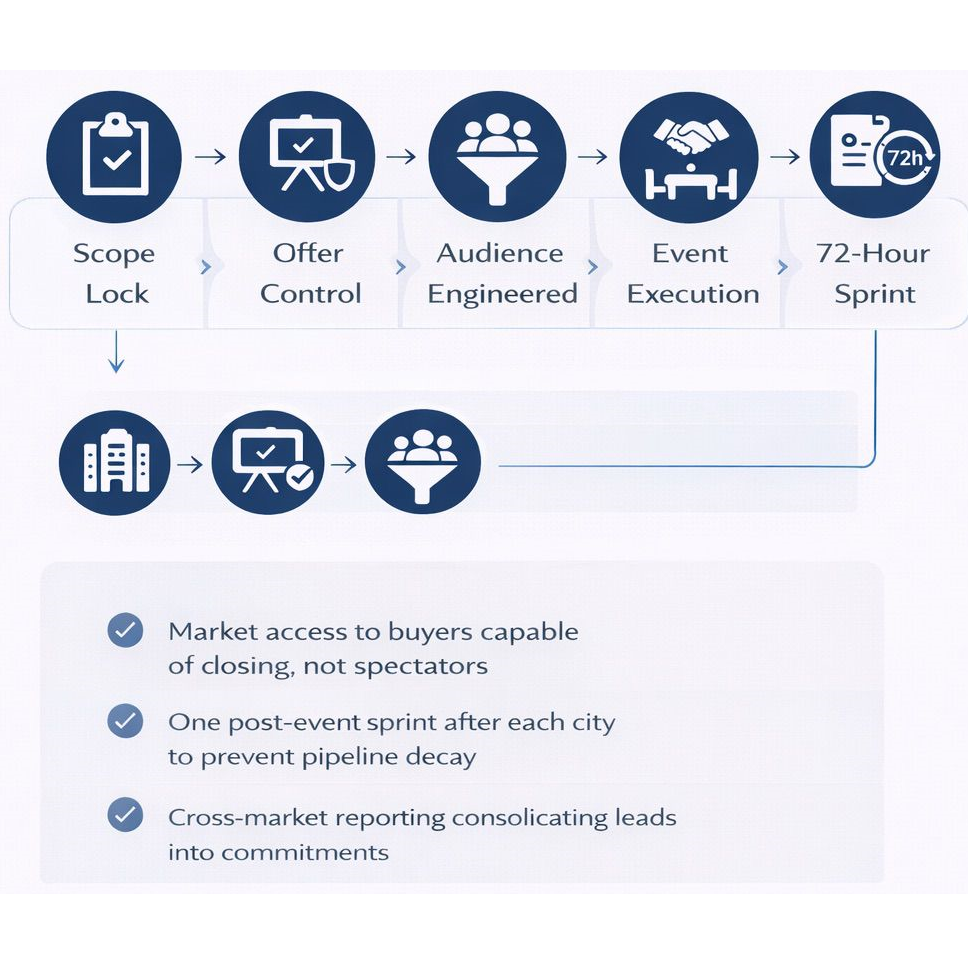 A 72-hour post-event sprint after each city to prevent pipeline decay and accelerate reservations and SPA progression.