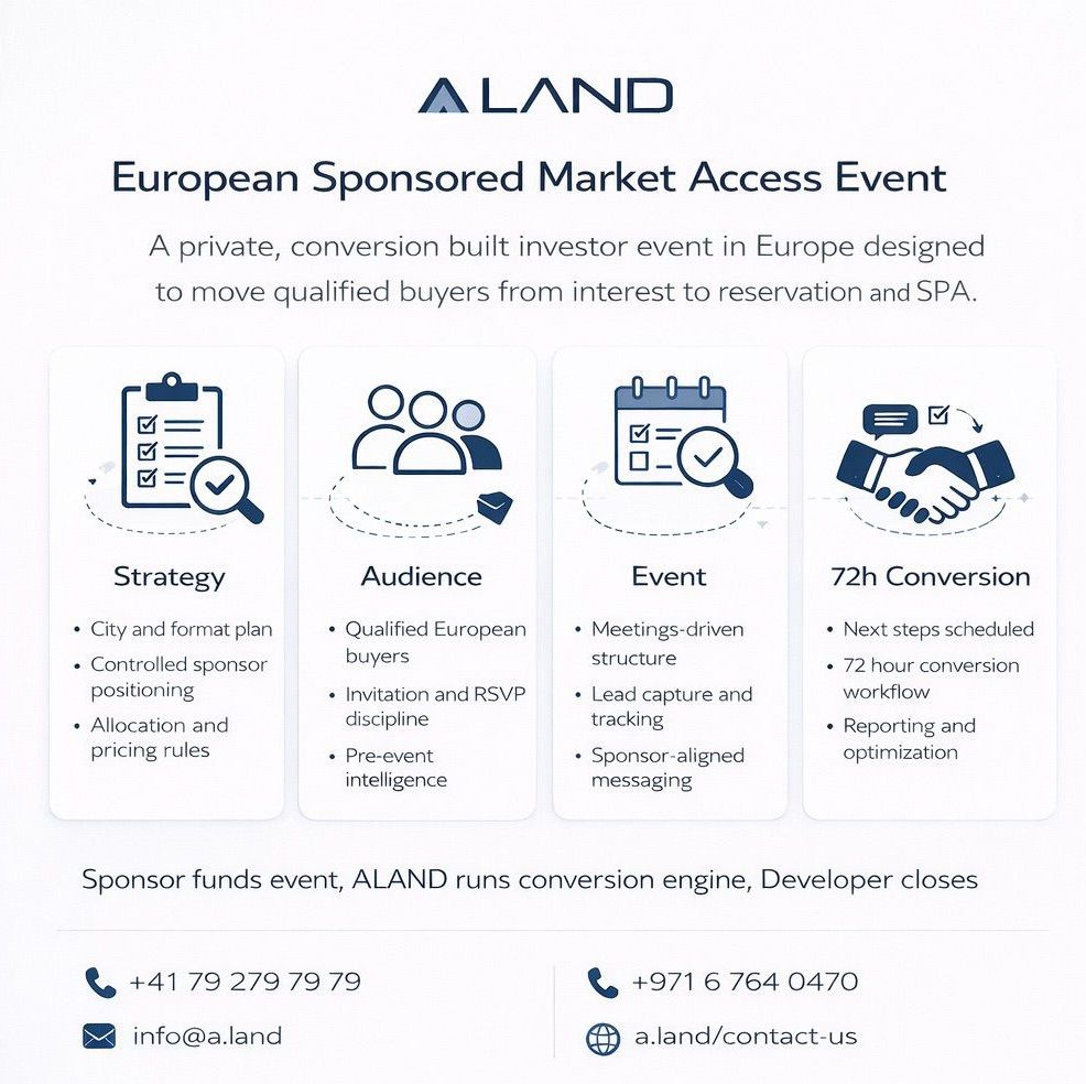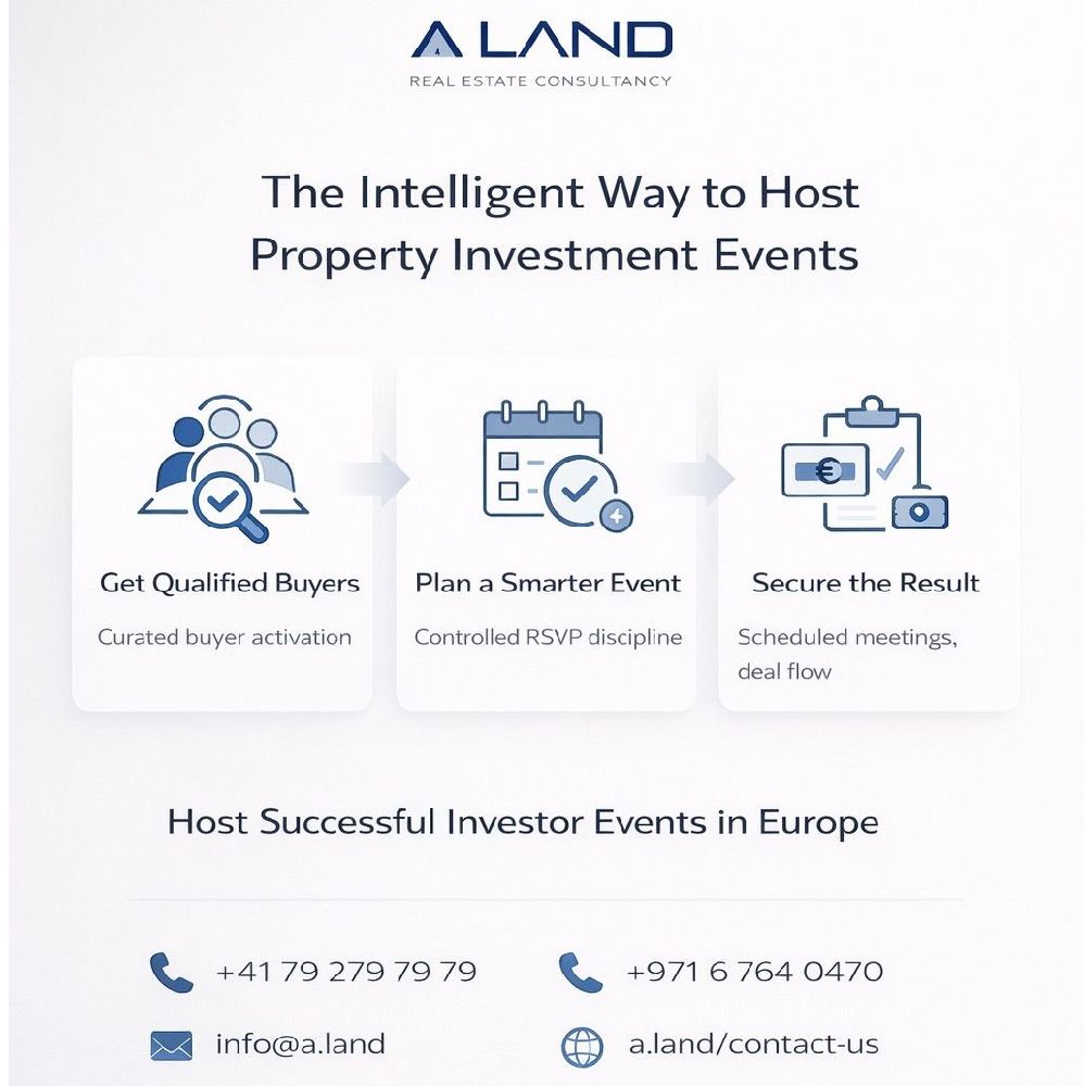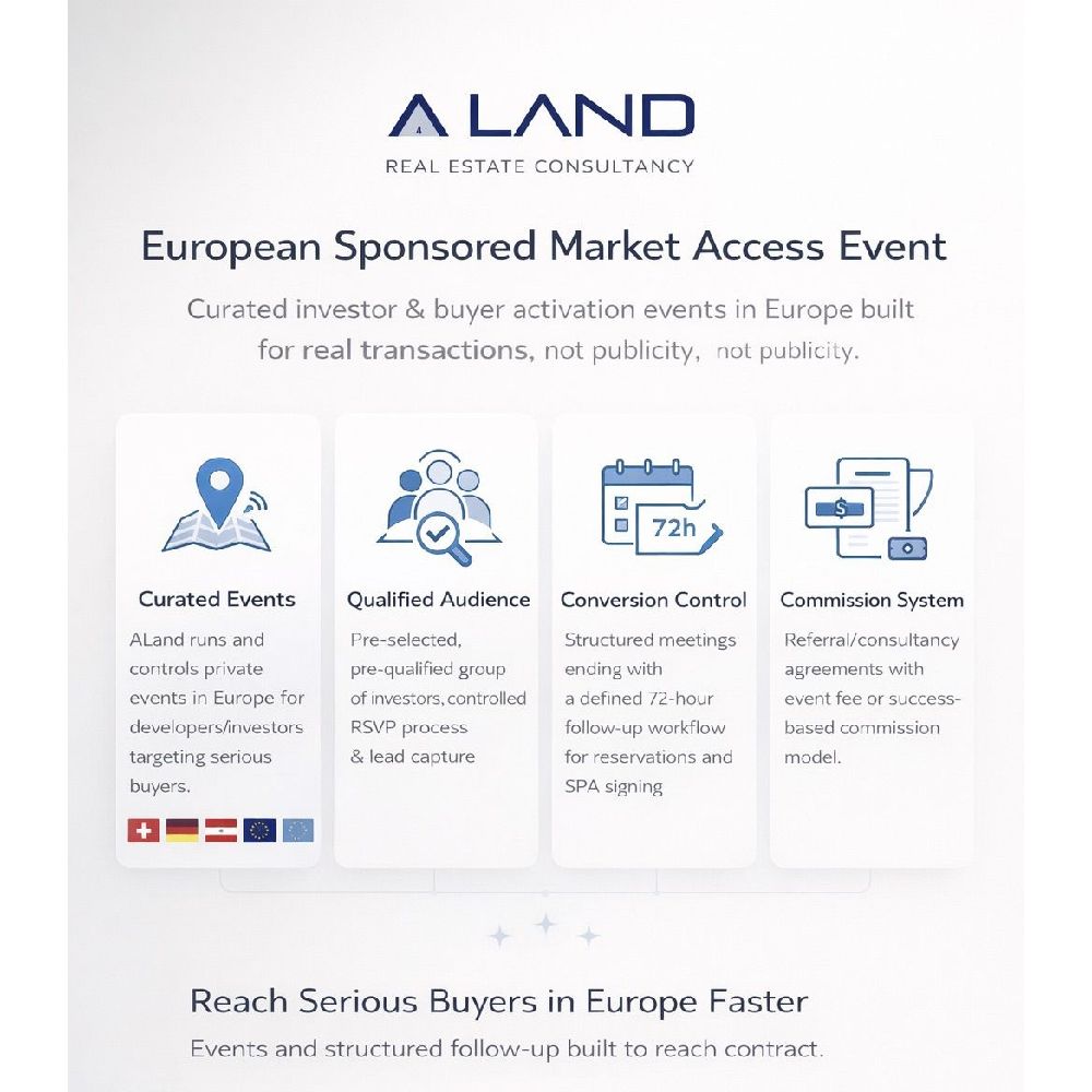 ALand designs and executes private investor and buyer activation events in selected European financial hubs, connecting your development with pre-screened acquisition groups, family offices, and qualified end buyers.