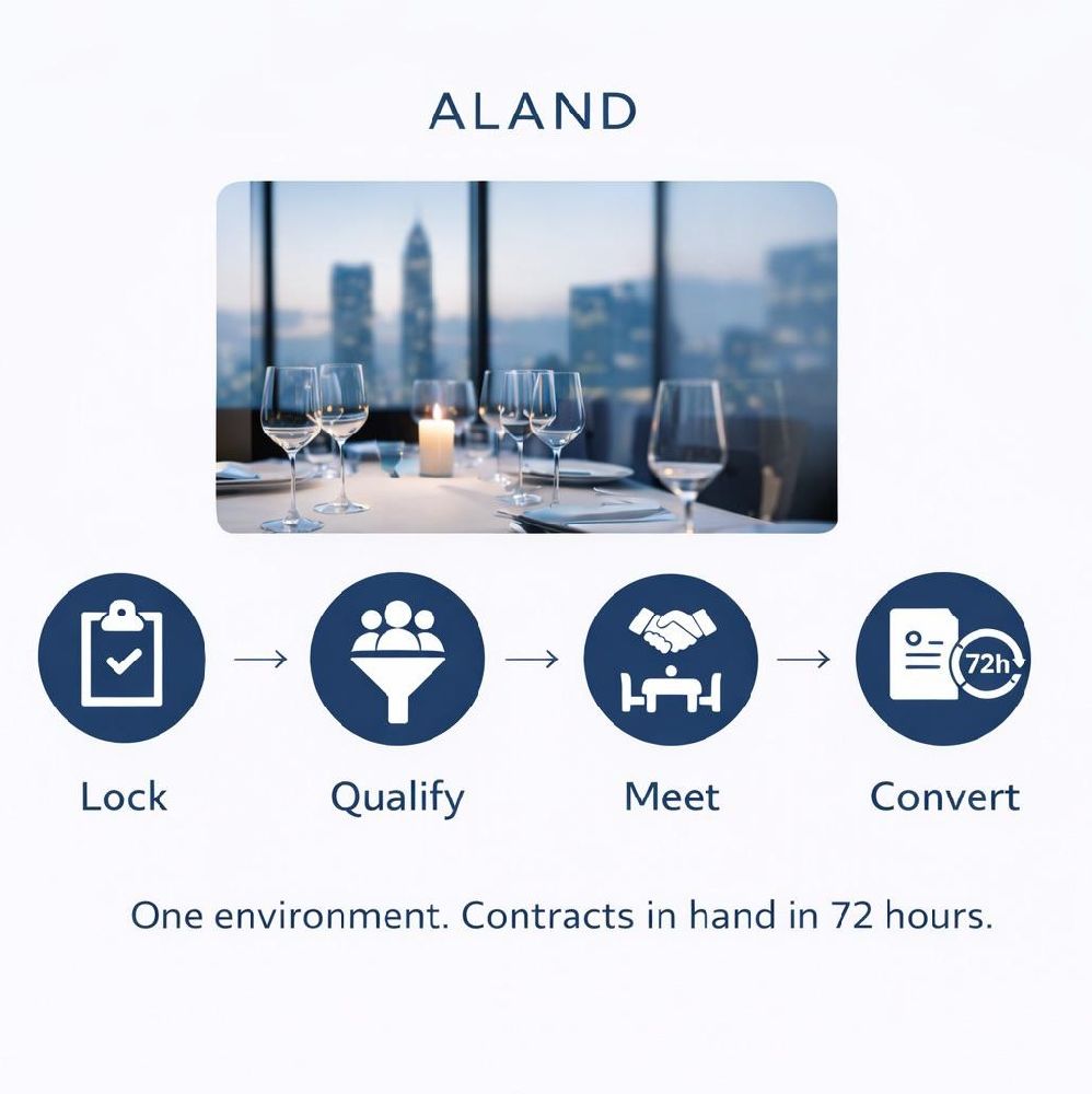This is not a networking dinner. It is a controlled acquisition environment designed around how high-value investors actually decide: in discreet rooms, with strong trust signals, clear rules, and fast next steps. ALand builds the room, controls the structure, captures the pipeline, and runs a 72-hour conversion sprint so momentum becomes contracts instead of fading into “let’s stay in touch.”