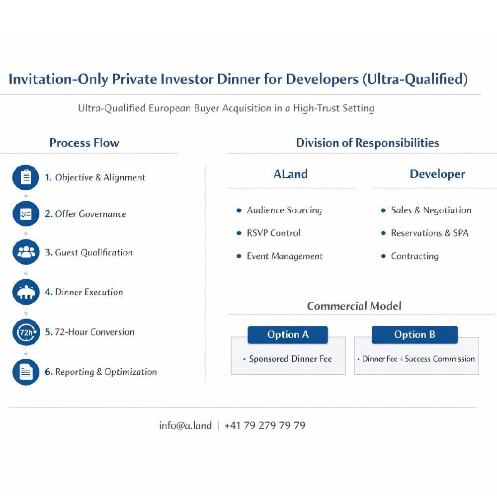 Engagement model: The developer sponsors the dinner infrastructure. ALand executes market access and conversion architecture. Commercial and referral terms are defined by MOU and agreement.
